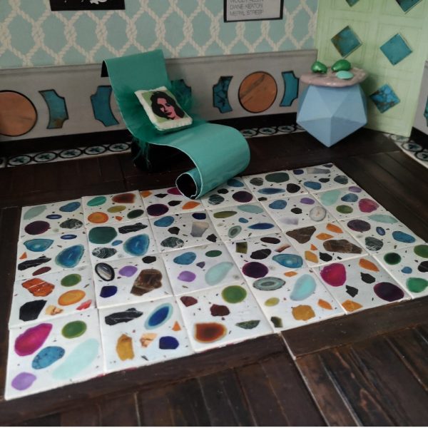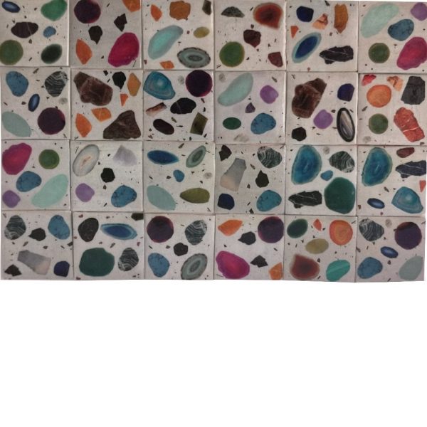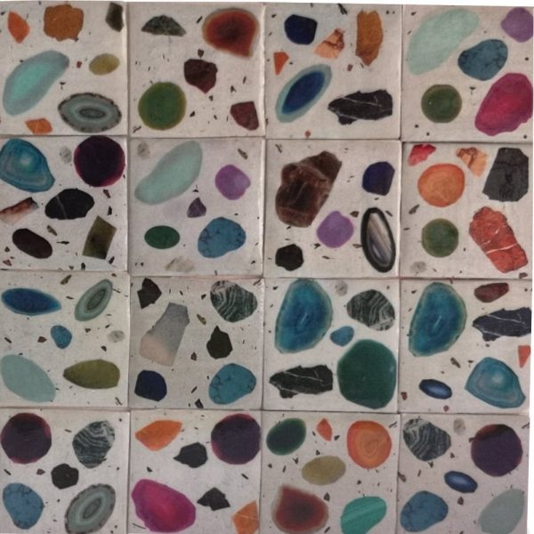 En las piedras ornamentales cada pieza es una imitación de baldosas reales, procesadas por ordenador para alcanzar el aspecto deseado. A continuación se imprimen en papel y se recortan. Paralelamente se cortan por separado los cuadrados de cartón, que se someten a una serie de tratamientos para darles cuerpo y relieve. Sobre ellos se pegan a mano las imágenes impresas, para después aplicar varias capas de barniz. Finalmente, cada una de ellas se coloca sobre un papel grueso, en filas de cuatro por seis columnas en este caso o en otras disposiciones.