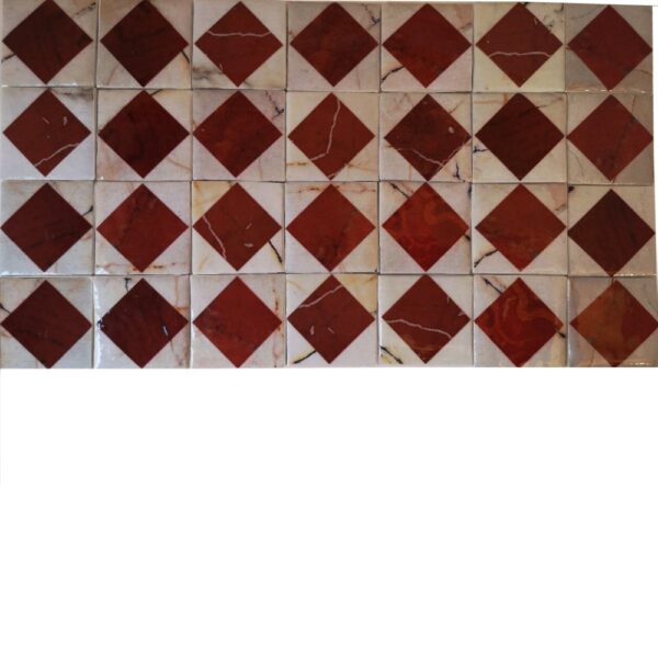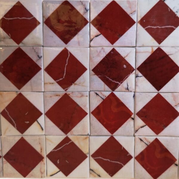 En las piedras ornamentales cada pieza es una imitación de baldosas reales, procesadas por ordenador para alcanzar el aspecto deseado. A continuación se imprimen en papel y se recortan. Paralelamente se cortan por separado los cuadrados de cartón, que se someten a una serie de tratamientos para darles cuerpo y relieve. Sobre ellos se pegan a mano las imágenes impresas, para después aplicar varias capas de barniz. Finalmente, cada una de ellas se coloca sobre un papel grueso, en filas de cuatro por siete columnas en este caso o en otras disposiciones.
