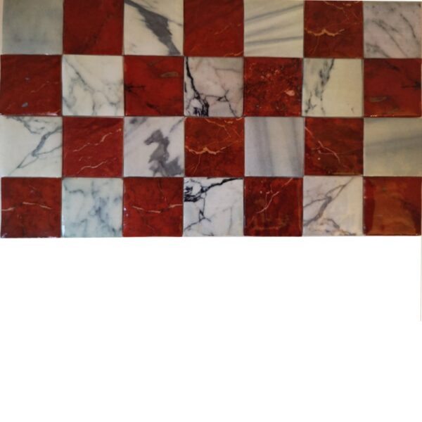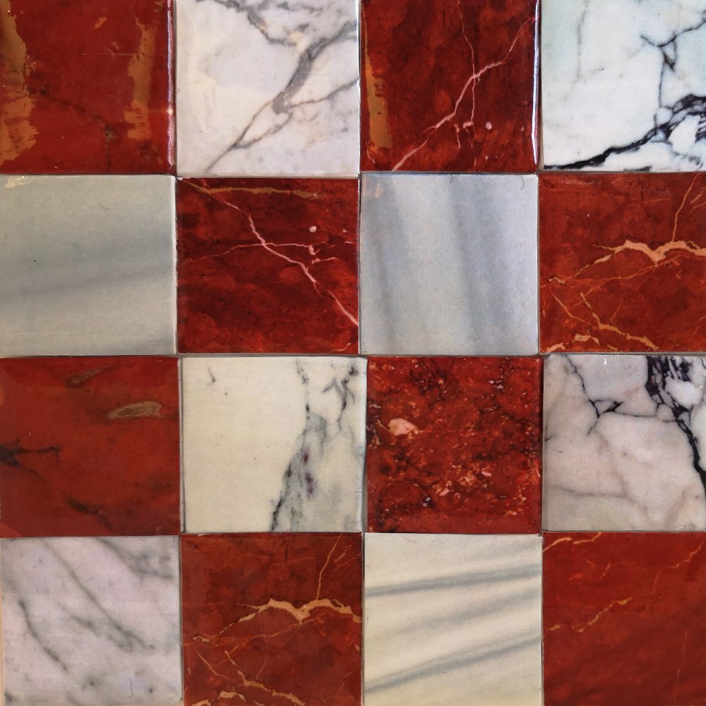 Suelo en damero de imitación de baldosas de mármol blanco alternando con otras de caliza roja; con brillo. Hecho a mano. Véase La habitación del piano de cola.
