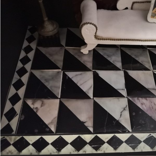 Los suelos que realizo no son muy grandes. En materiales descargables proporciono el diseño que imita las tablas de madera de color wengué (marrón oscuro), piezas de hormigón o de mármol crema veteado para imprimir y recortar. Éstos combinan bien con cualquier pavimento, y pueden completar los huecos y cubrir la totalidad de la superficie a embaldosar. También se adjuntan cenefas coloridas para adaptarse a todas las medidas, que pueden rodear o unir los distintos tipos de suelos. En varios de mis tutoriales explico cómo colocar y pegar la totalidad de los elementos descargables descritos para conseguir un suelo bien acabado y bonito.
