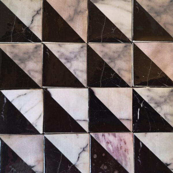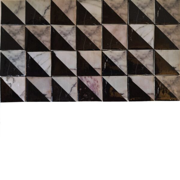 En las piedras ornamentales cada pieza es una imitación de baldosas reales, procesadas por ordenador para alcanzar el aspecto deseado. A continuación se imprimen en papel y se recortan. Paralelamente se cortan por separado los cuadrados de cartón, que se someten a una serie de tratamientos para darles cuerpo y relieve. Sobre ellos se pegan a mano las imágenes impresas, para después aplicar varias capas de barniz. Finalmente, cada una de ellas se coloca sobre un papel grueso, en filas de cuatro por siete columnas en este caso o en otras disposiciones.