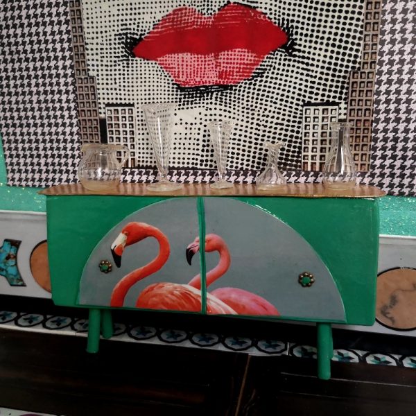 Se ha aplicado imprimación y pintura. En una de las caras se han añadido imágenes de flamencos, y en la otra se han aplicado piezas metálicas en forma de líneas quebradas; barnizado posterior aplicado por todo el aparador. Las puertas no se abren, la pieza es únicamente decorativa. Totalmente hecha a mano.