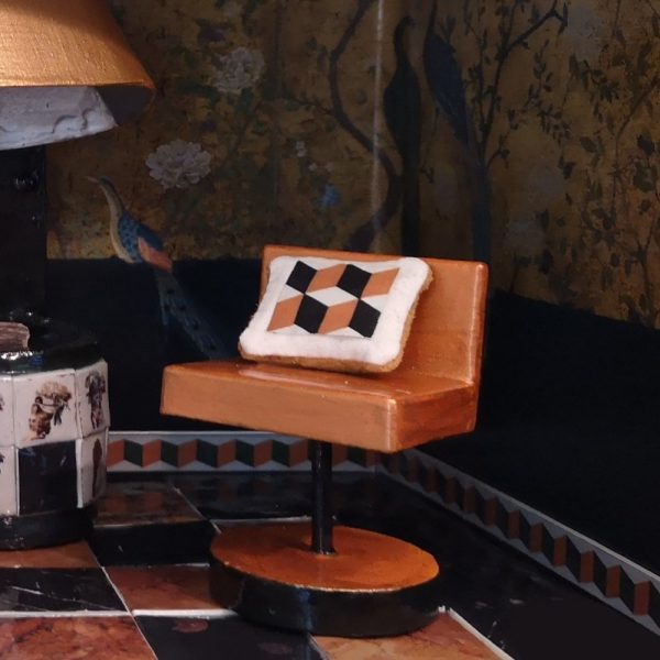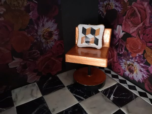Sillón de color cobre realizada con plástico, cartón y yeso, con la base de madera. Véanse también los escenarios La habitación en penumbra y Sala con mural de jardín con aves.