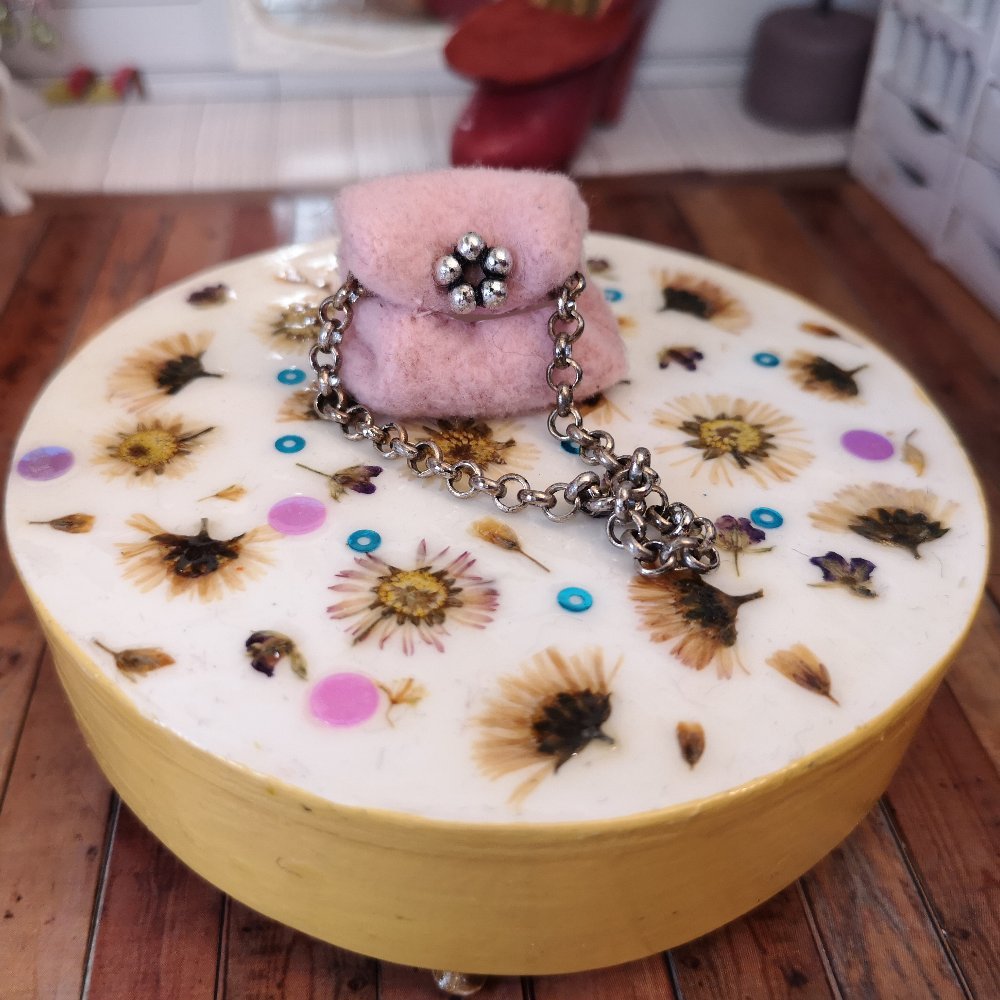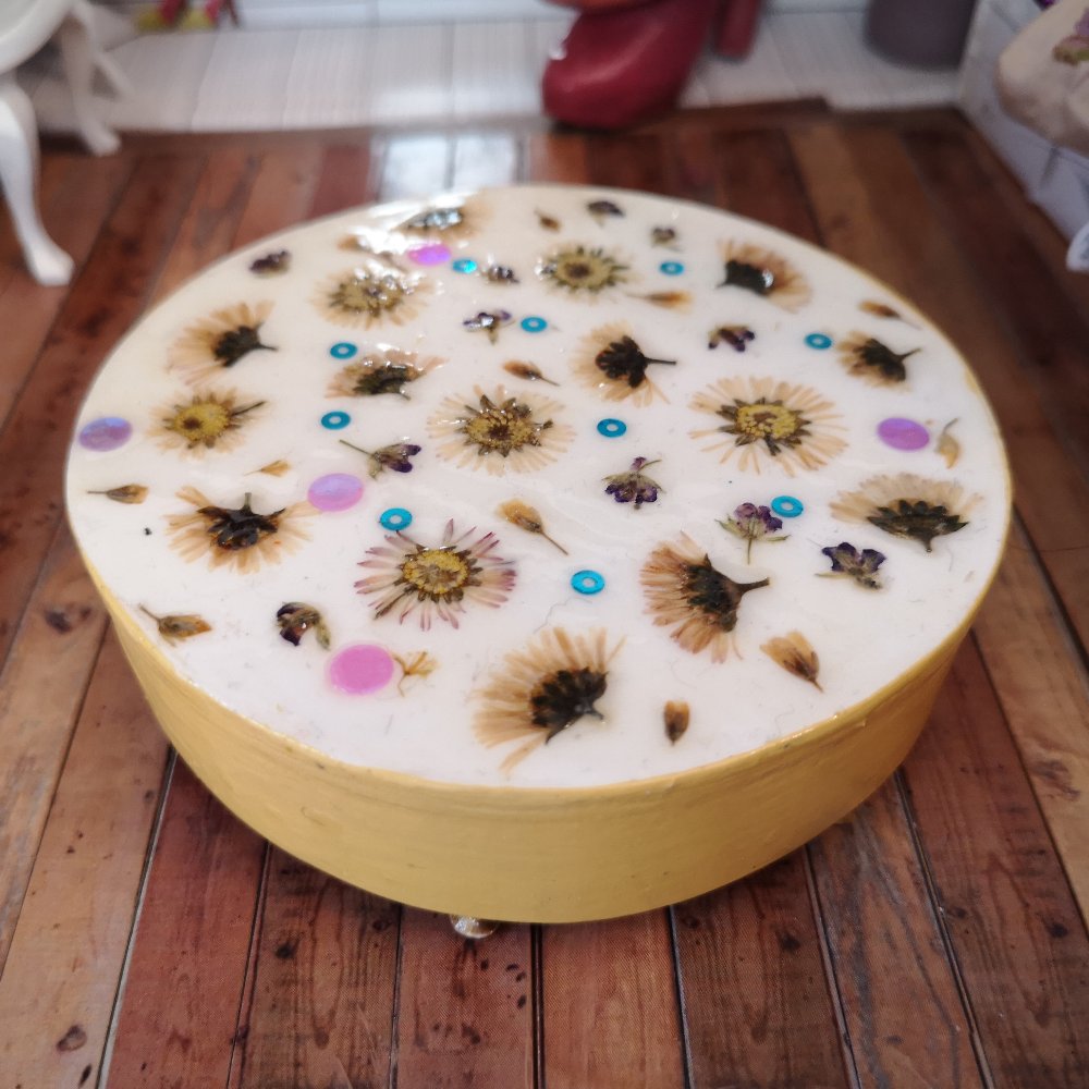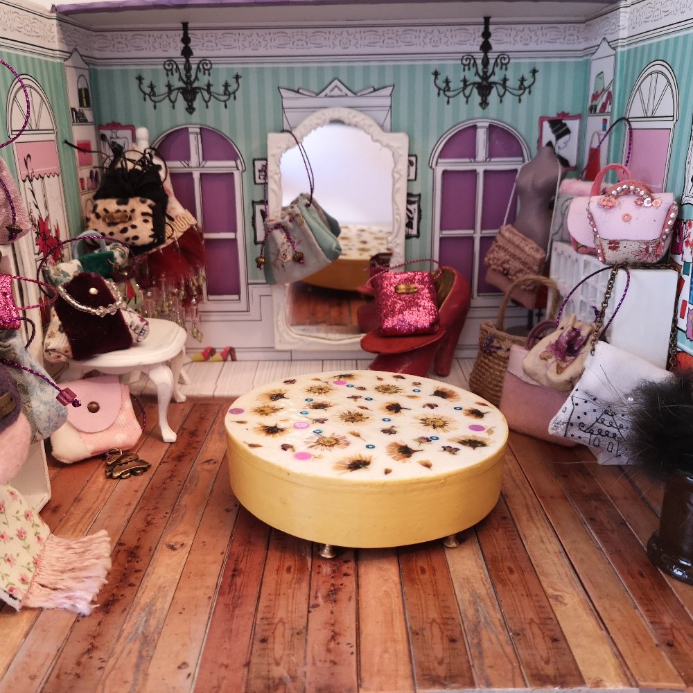 Mesita blanca y amarilla con flores naturales secas recogidas en el campo, incrustadas en su superficie. Véase también el escenario El rincón de las ágatas.
