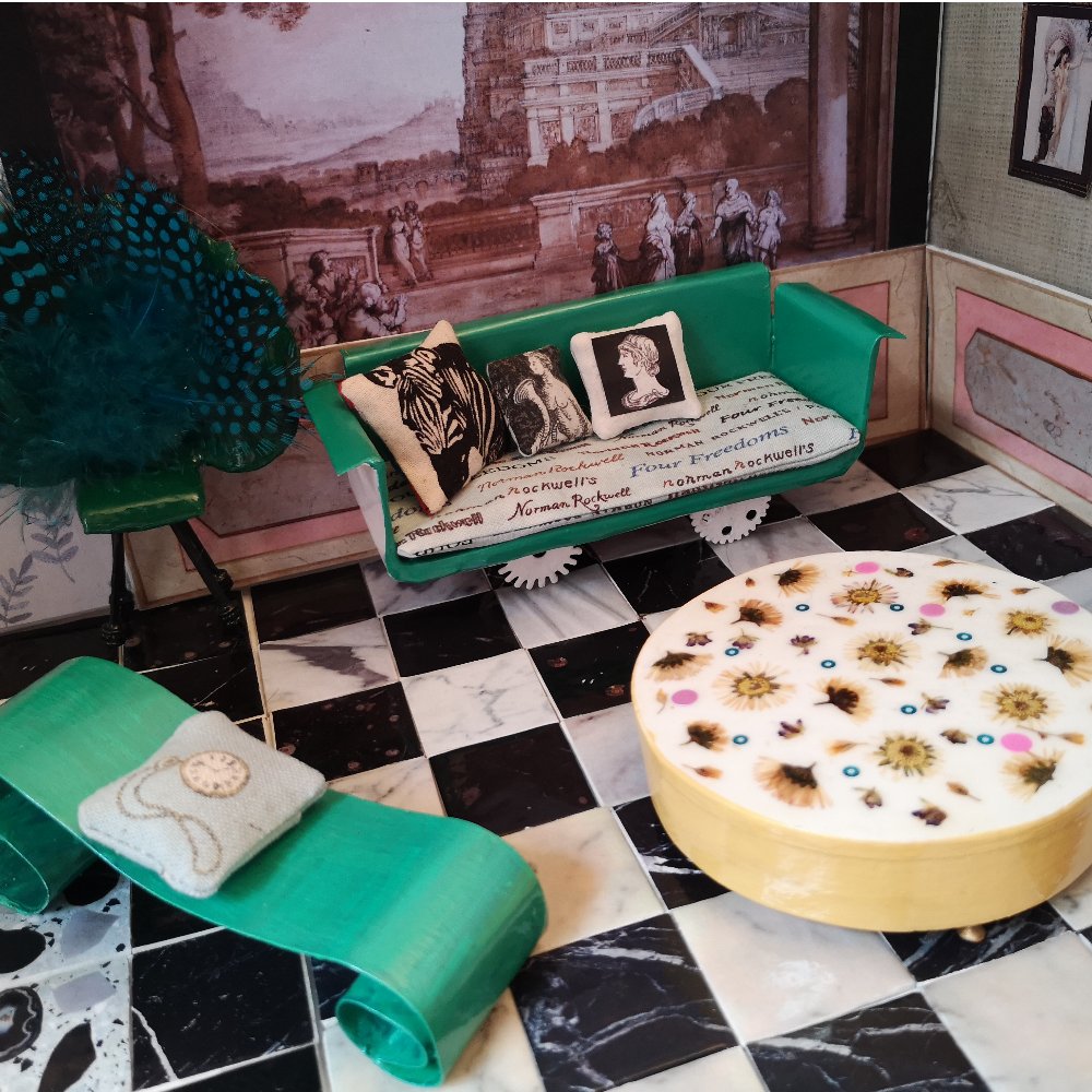 Elaboro productos en miniatura hechos a mano, pequeñas obras artísticas, entre las que destacan baldosas y muebles artesanales. Aparte diseño interiores y construyo escenarios con decoración actual. También realizo cuadros y objetos decorativos. Dispongo de tutoriales, paso a paso de mis trabajos, y materiales para descargar.
