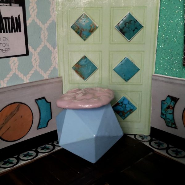 Mesita azul y lila inspirada en un frasco de perfume. Véanse también los escenarios El rincón de las ágatas y Liz invitó a Marilyn.
