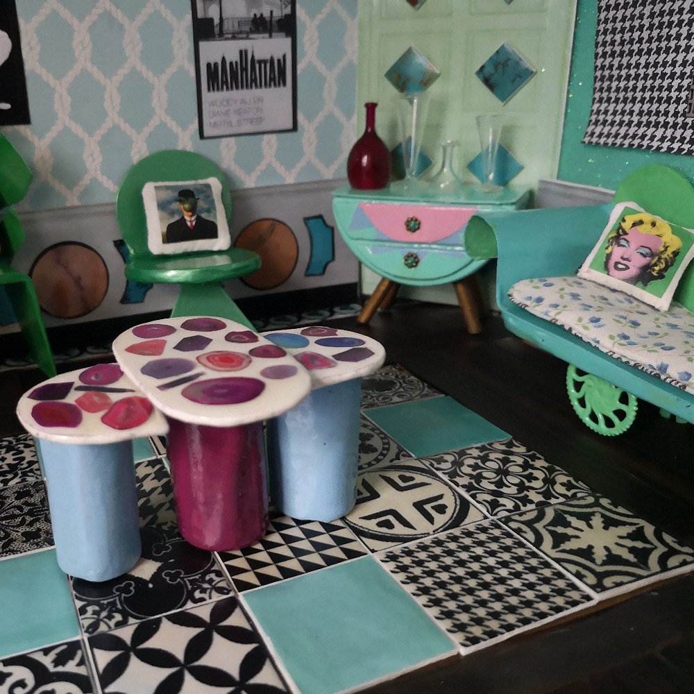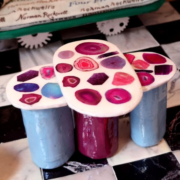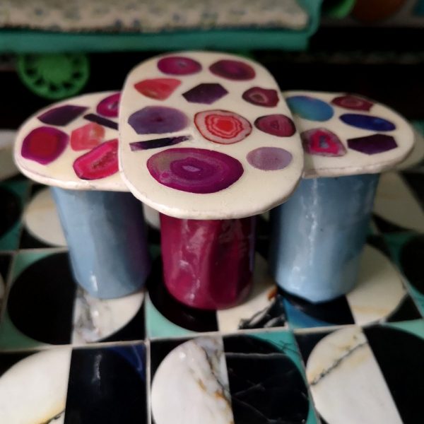 Juego de tres mesitas de centro con aplicación de ágatas de distintos colores. Véanse también los escenarios Liz invitó a Marilyn y El rincón de las ágatas.
