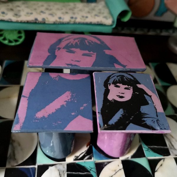 Juego de tres mesitas de centro con foto de mujer. Véase también el escenario Liz invitó a Marilyn.