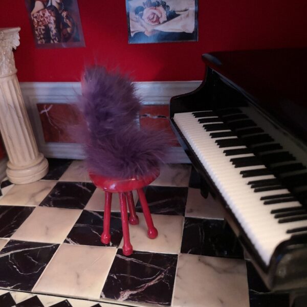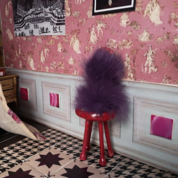 Silla granate realizada con metal, cartón y yeso, patas de madera. Véanse también los escenarios La habitación con dosel floreado , Mi salón ideal: el comedor W. Allen.y La habitación del cabecero griego.