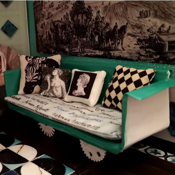 Sofá metálico de color verde y blanco, con ruedas como patas. Realizado en metal y cartón, y sellado con yeso. Aplicación posterior de imprimación, pintura, barniz, y tapizado final con tela de calidad. Véanse también los escenarios Liz invitó a Marilyn y El rincón de las ágatas.