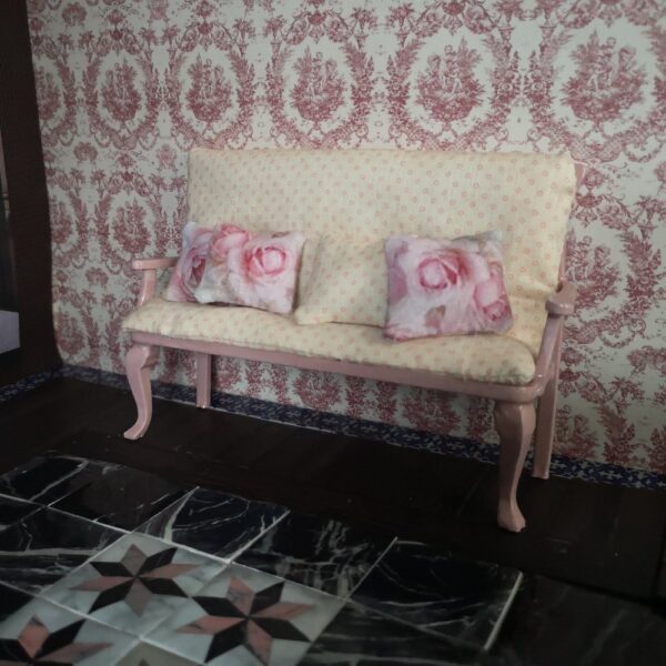El sofá es de madera, la realización del pintado del mueble en tono salmón, el tapizado con topitos en ese tono y la confección de los cojines de rosas, que se incluyen en el conjunto se han efectuado a mano. Véanse también los escenarios La habitación en penumbra y La casa del obispo.