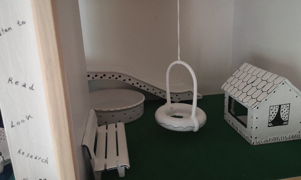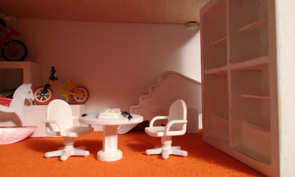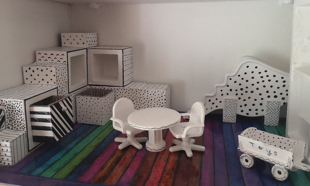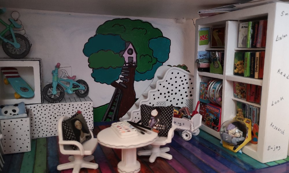 En la planta intermedia hice el diseño de la distribución de muebles. Casi todos muebles los fabriqué a mano; la mesita con un botón de madera y el carrete de un hilo; las sillas y el tobogán eran juguetes reciclados de mis hijos. La estantería en escalera la hice con cajitas y piezas de madera.