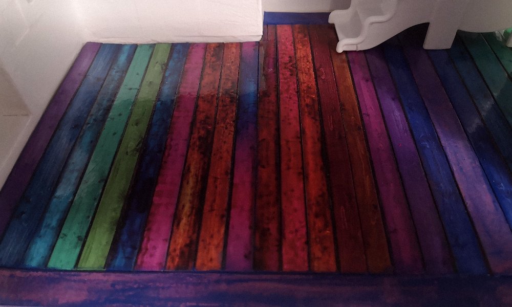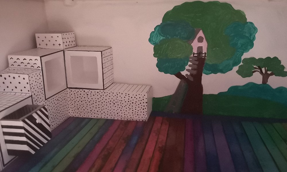 … o diseñé el suelo. En esta imagen se muestran los muebles ya pintados, el momento de la prueba del suelo planteado con el colorido de los muebles.