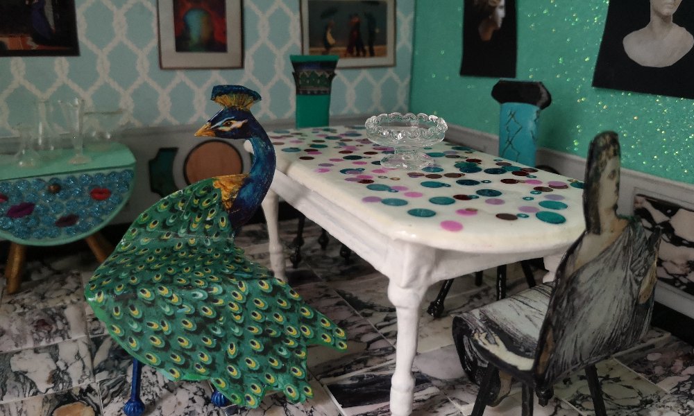 En otros casos las sillas llevan impreso un dibujo diseñado en el ordenador, por ejemplo la silla pavo real, que además se muestra en la galería de imágenes de comedor con mármol brechoide. La estructura, por otro lado, la he realizado con metal y cartón como en el caso anterior.
