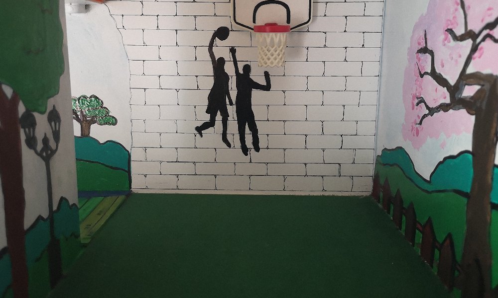 En el lado derecho hice lo mismo; también coloqué un suelo que imitaba el césped artificial, a modo de zona de juegos de la calle.