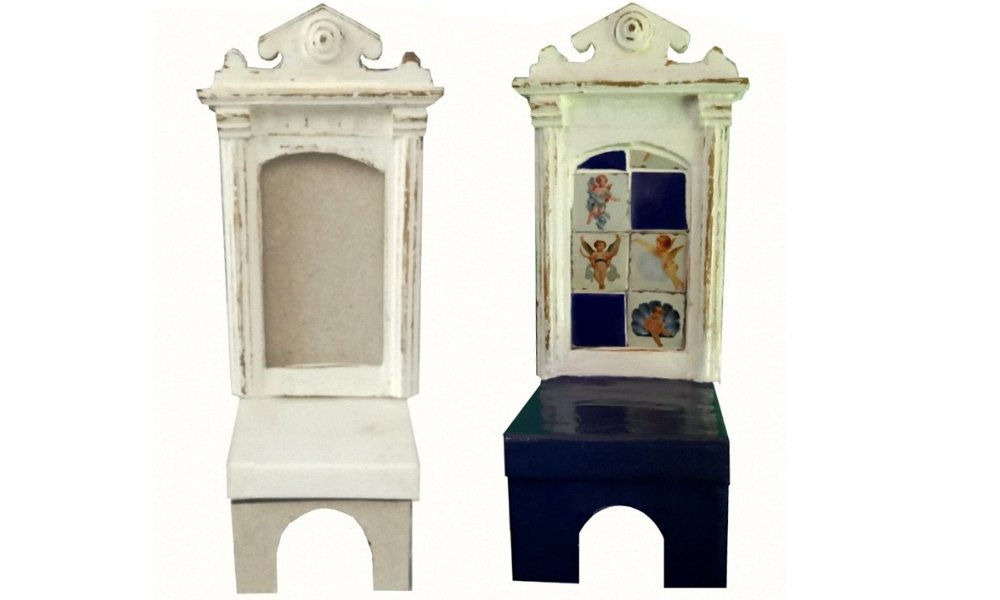 Finalmente pegué cada baldosa sobre el armazón de la estructura, (figura superior derecha) y coloqué las piezas que se superponen a la base alicatada. Volví a sellar algunos huecos creados con yeso y retoqué pequeños fallos con pintura azul o blanca (figura inferior).