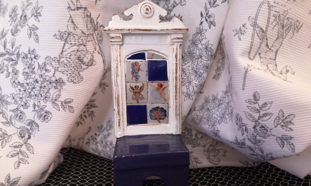 Os presento mi silla, con respaldo clásico de madera decapada en blanco, con incrustación de baldosas con motivos de angelitos. Podemos encontrarla también en el escenario en que se exhiben otras sillas: un rincón de mi casa.
