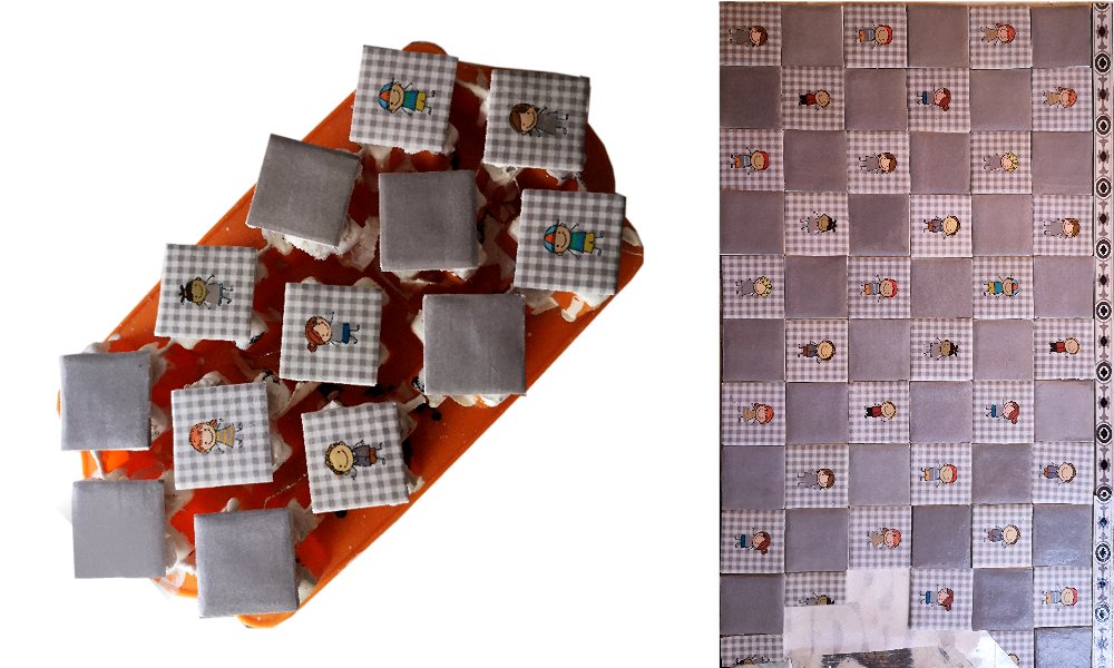 Por otro lado, corté los cuadraditos de cartón que son la base de las baldosas; estos últimos los sometí a varios tratamientos para darles cuerpo y color.