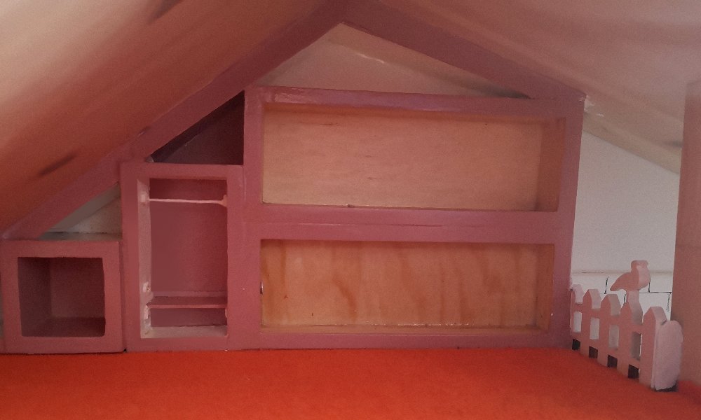 Las estanterías las realicé con varias cajitas de madera y las uní con cola de carpintero y unos tornillos. La cerca con el pajarito comprada tal cual en una tienda de complementos de madera. En el armarito central puse una barra y un estante. La zona abuhardillada superior la hice con cartón y unas tablas de madera, ajustadas en el hueco triangular a modo de molduras. Añadí yeso para rellenar huecos y apliqué directamente pintura salmón y blanca, tal y como se muestra en la imagen.