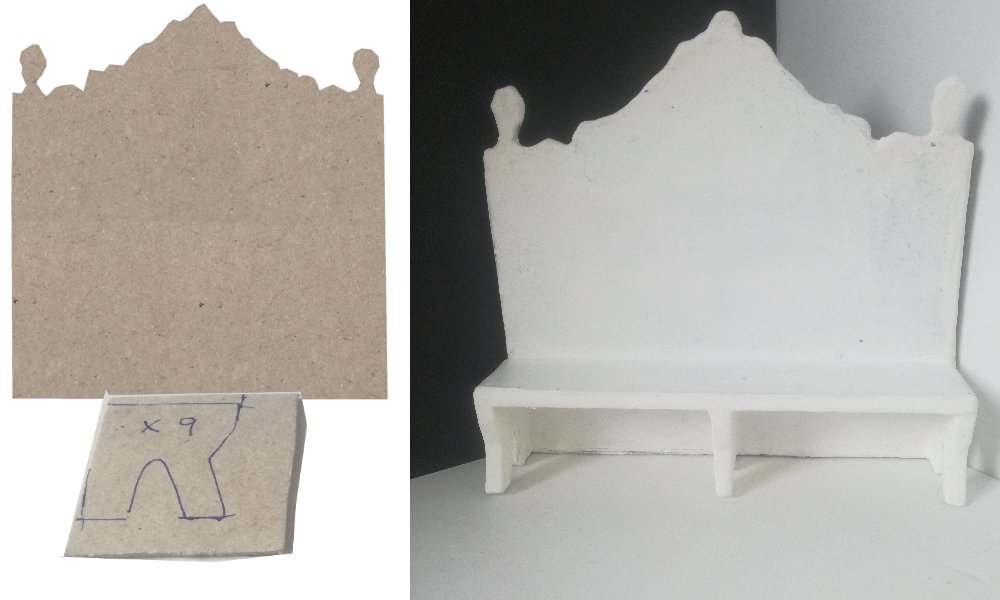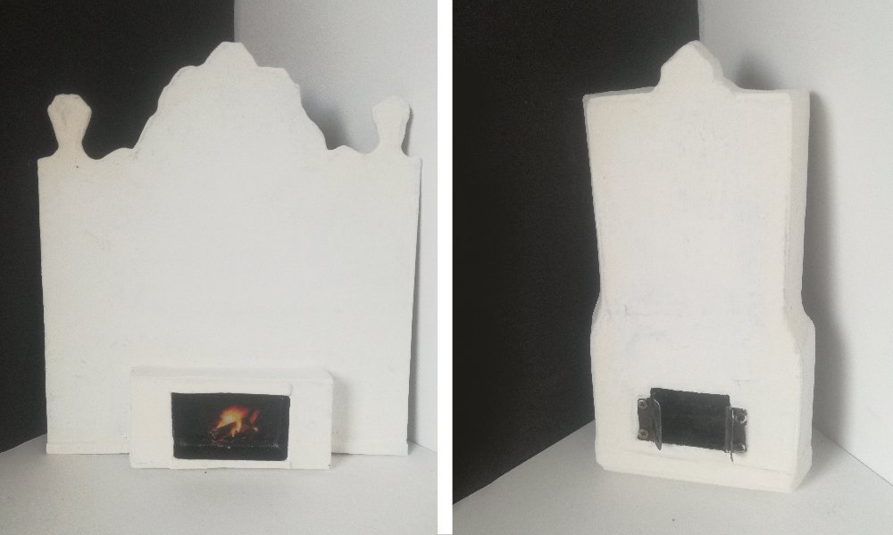 Hice el boceto de la chimenea holandesa en papel y luego lo trasladé a cartón, teniendo en cuenta la medida de las baldosas (1,6 x 1,6 cm), la anchura del hogar, la forma de la parte superior de la campana y los distintos relieves que quería aplicar.