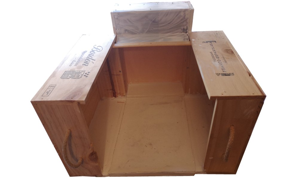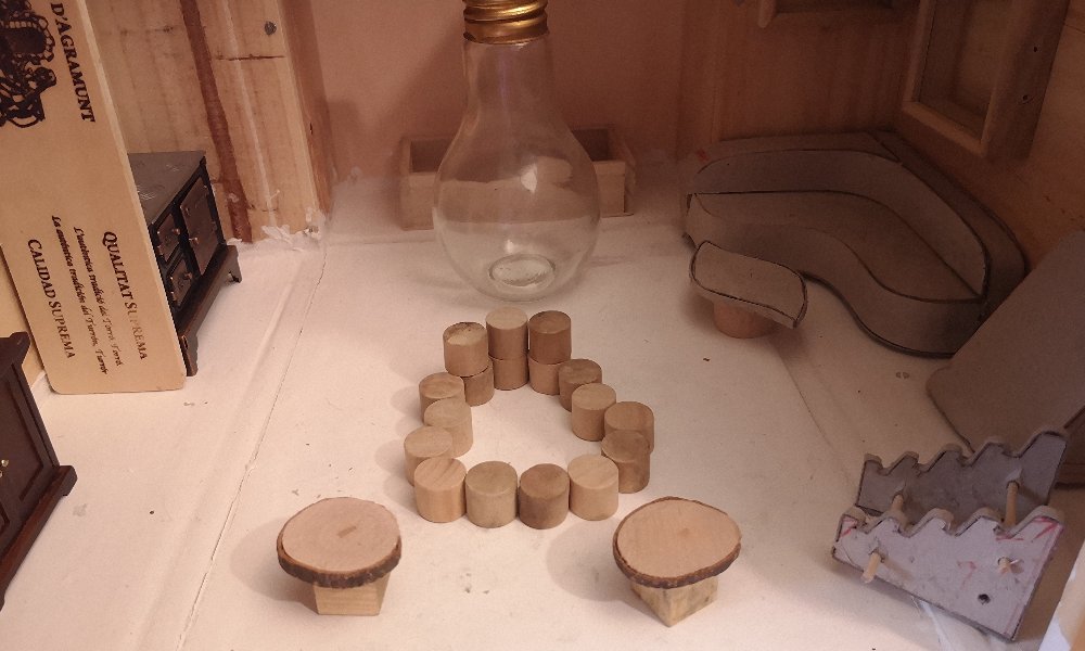 Esta estructura consta de tres cajas de madera que anteriormente contenían botellas de vino. Las he unido-pegado con unos tornillos y con cola de carpintero, a la vez que las tapas las he reconvertido en el suelo del escenario. He añadido cartón en algunas zonas y he sellado los huecos con yeso. La parte superior es metálica, y creo que la pintaré y alicataré con baldosas, y le pondré el nombre del escenario. La idea es que sigan pareciendo lo que son, cajas de botellas de vino, incluso manteniendo las asas de cuerda. Quiero conseguir un espacio que se asemeje a un patio interior por lo que en la parte central colocaré un jardín minimalista con piedras. El conjunto estará acristalado en la parte superior y delantera.