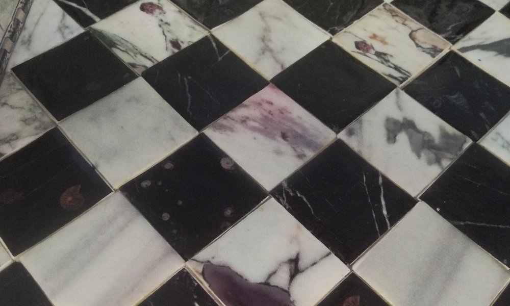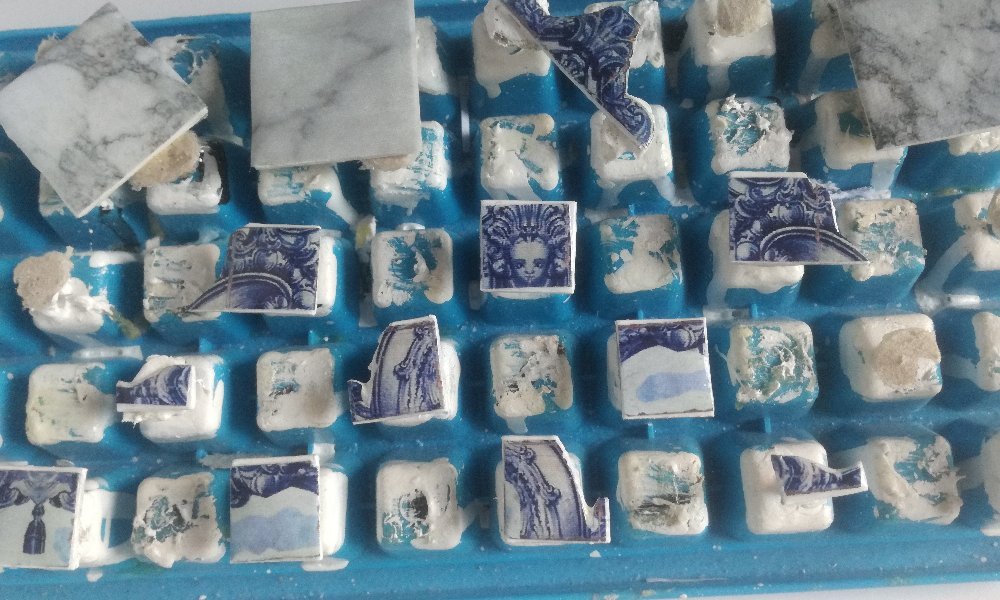 También preparé los cuadrados de mármol que rodean al adorno circular alicatado con baldosas, las cuales las sometí al mismo proceso de realización que las de los murales o las del suelo.