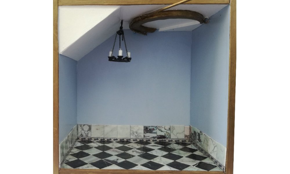Las baldosas y la parte superior de la campana las diseñé por ordenador. Las imprimí, barnicé y corté con la cizalla.