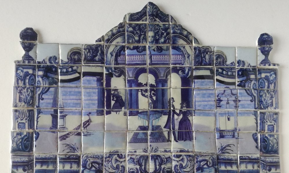 Seguidamente los escaneé y los incorporé a un marco portugués, retocando el conjunto con un programa de dibujo en el ordenador. Dividí la imagen en cuadraditos, los imprimí y los corté con la cizalla.