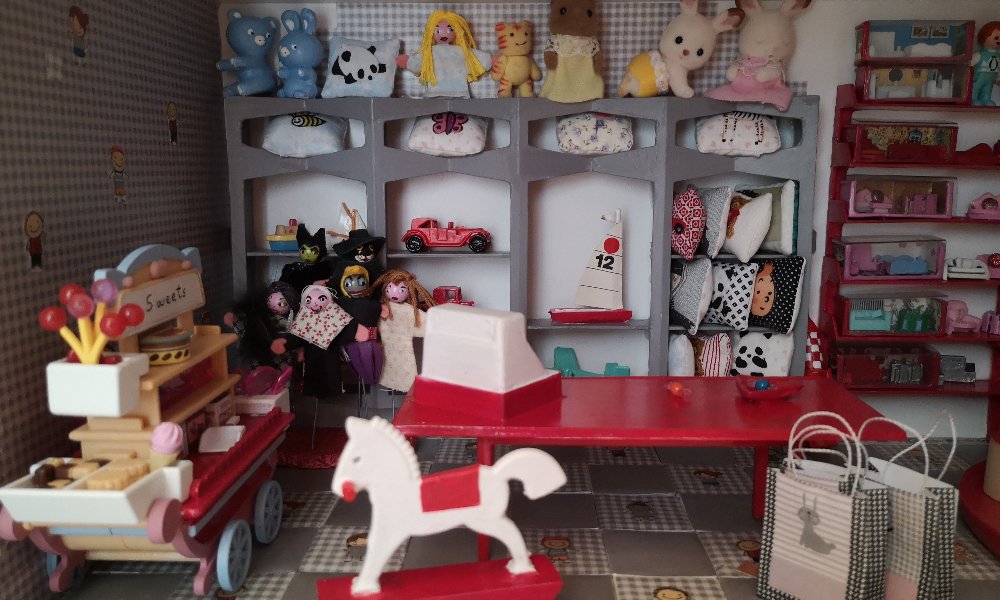 Resultado final, sólo quedaba colocar los juguetes… En el trabajo Juguetería: la tienda salen fotos completas del escenario. En mis tutoriales os enseñaré a realizar algunos de los juguetes que aparecen en las fotos.