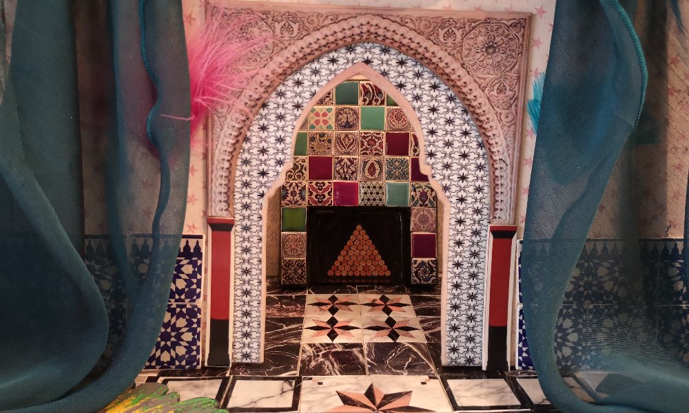 El escenario era un cuadrado perfecto que decoré exteriormente con pintura dorada. En la esquina superior izquierda del techo creé una forma abuhardillada con cartón y yeso; en la esquina superior derecha añadí un semicírculo, realizado también en cartón y yeso, con un cordón acoplado que se sujeta en sus extremos por ojos de buey, y que permite fruncir la cortina de la bañera. Pinté el fondo de color azul; el techo y el suelo en blanco.