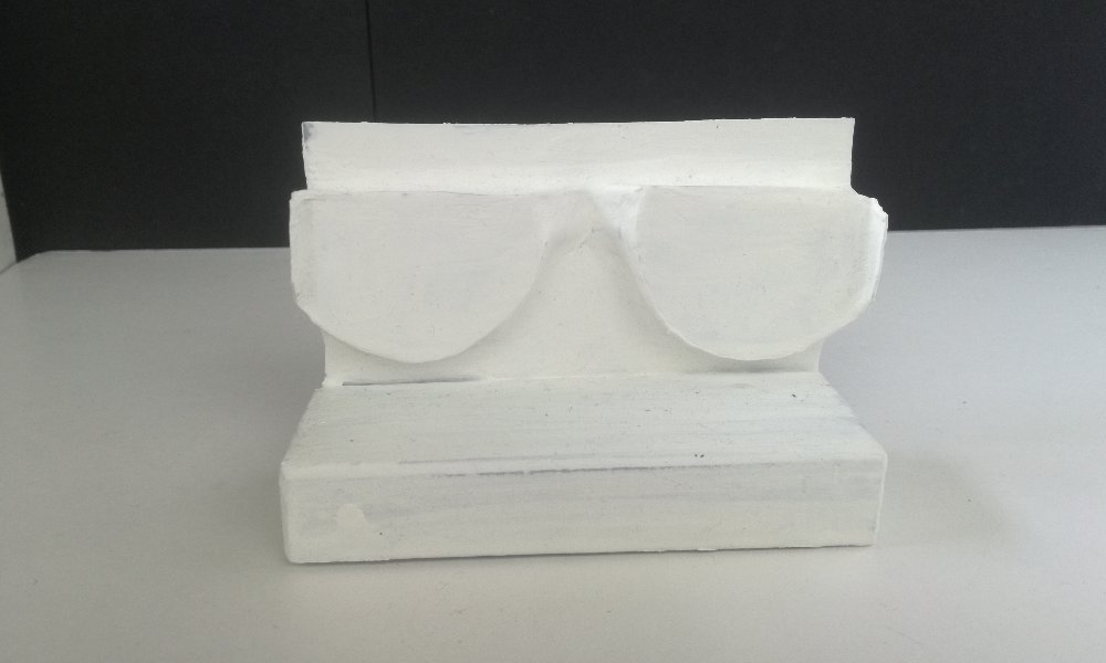 El armazón de El sofá de gafas negras que podéis también encontrarlo en la galería de imágenes de una de la estancias de mi salón ideal y en un escenario en que se exhiben otras sillas: un rincón de mi casa. Lo realicé con una pieza rectangular de madera en su base, y un respaldo que combina metal y cartón. Finalmente sellé la estructura con yeso y apliqué imprimación.