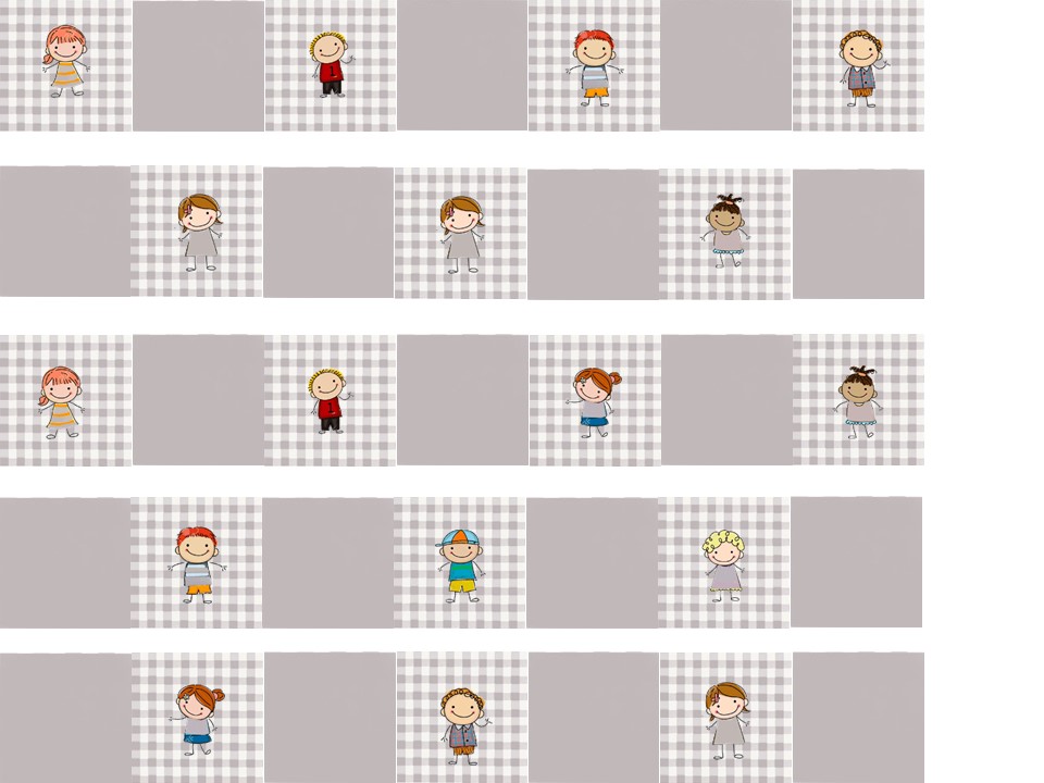 Después pegué las piezas recortadas de papel, que componen el mural, a cada uno de los cuadraditos de cartón que se muestran en la imagen.