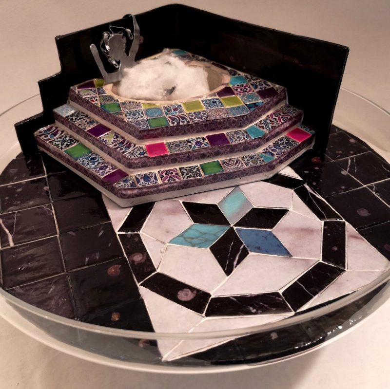 La bañera escalonada está revestida de baldosas árabes con su ornamentación característica. En ella una chica en metal disfruta de un baño de espuma. Todos los elementos salvo la bombonera (de 30 cm de diámetro x 24 cm de altura) están hechos a mano.