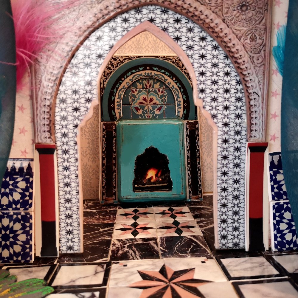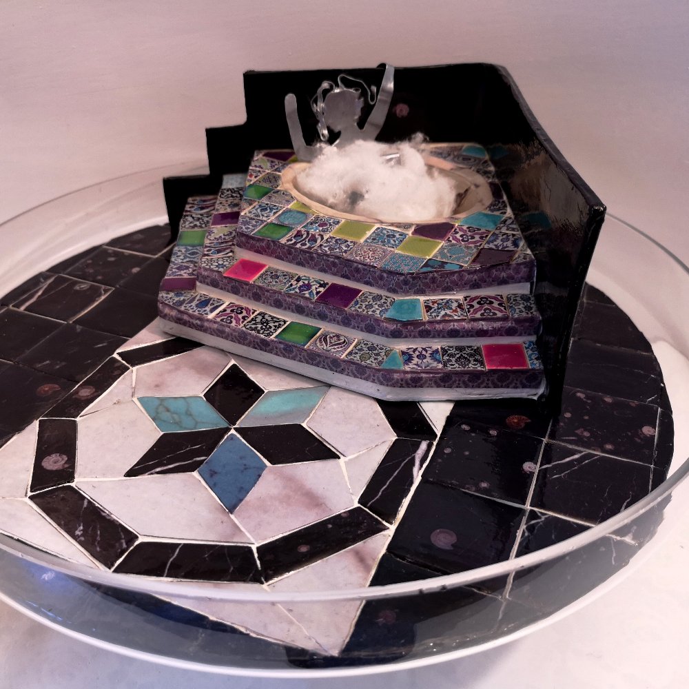 La bañera escalonada está revestida de baldosas árabes con su ornamentación característica. En ella una chica en metal disfruta de un baño de espuma. Todos los elementos salvo la bombonera (de 30 cm de diámetro x 24 cm de altura) están hechos a mano.