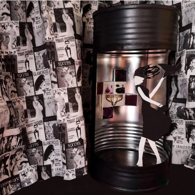 ¡Qué interesante es reciclar! Investigar en las nuevas posibilidades que nos ofrece un mismo objeto creado para un fin determinado y que podemos aplicar para otros usos. Con esta idea o hilo conductor se desarrolla este escenario, a partir de la antigua lata envolvente de un perfume, y dejándonos llevar un poco por el surrealismo al observar la escena: una chica vestida saliendo de la ducha y con paraguas, azotada por los efectos de un vendaval.
