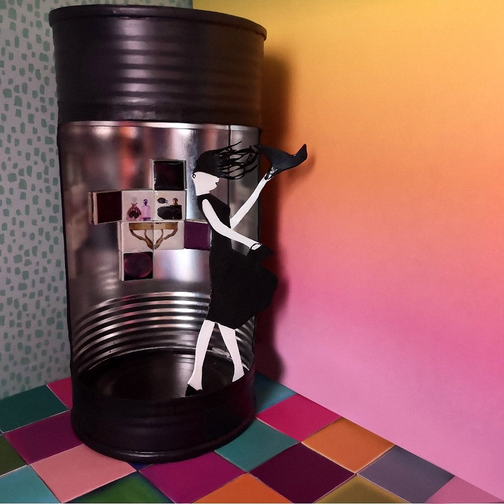 ¡Qué interesante es reciclar! Investigar en las nuevas posibilidades que nos ofrece un mismo objeto creado para un fin determinado y que podemos aplicar para otros usos. Con esta idea o hilo conductor se desarrolla este escenario, a partir de la antigua lata envolvente de un perfume, y dejándonos llevar un poco por el surrealismo al observar la escena: una chica vestida saliendo de la ducha y con paraguas, azotada por los efectos de un vendaval.