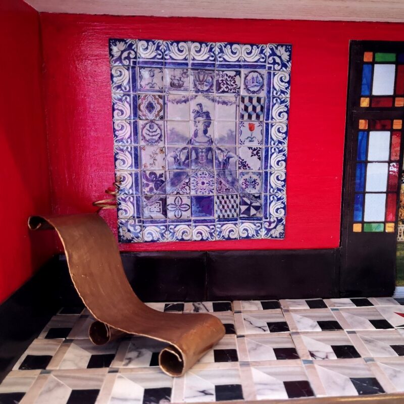 En la pared hay un mural de azulejos de inspiración portuguesa en combinación cromática de azul cobalto y blanco, además de una tumbona dorada. El suelo está revestido por tres tipos de baldosas: unas de imitación de mármol con formas geométricas en tonos crema y negro, otras de color blanco y, enfrente de la puerta de salida al jardín o dispersa entre las blancas, se sitúan otras con motivo estrellado.