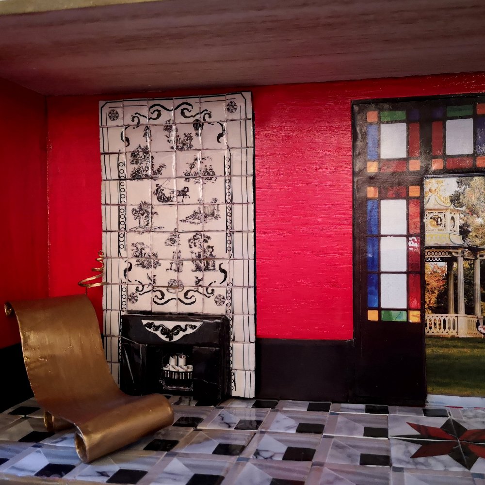 En la pared hay un mural de azulejos de inspiración portuguesa en combinación cromática de azul cobalto y blanco, además de una tumbona dorada. El suelo está revestido por tres tipos de baldosas: unas de imitación de mármol con formas geométricas en tonos crema y negro, otras de color blanco y, enfrente de la puerta de salida al jardín o dispersa entre las blancas, se sitúan otras con motivo estrellado.