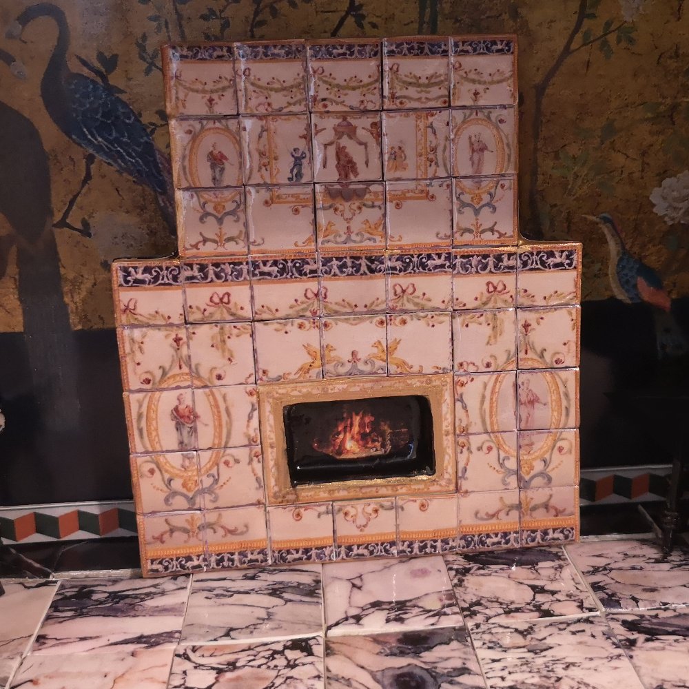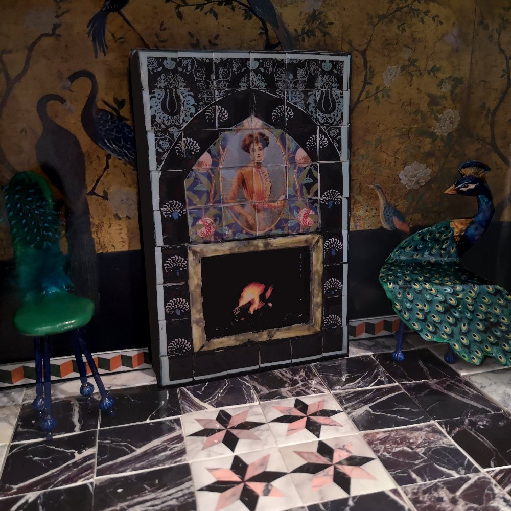 Descubramos poco a poco sus elementos. En la pared observamos un papel pintado inspirado en un jardín de aves con zócalo de color azul oscuro; en su parte inferior, una cenefa en color verde y naranja bordeando todo el suelo. El pavimentado compuesto por baldosas de imitación de mármol brechoide con una franja de calizas negras en los laterales. Conforman el mobiliario dos sillas singulares, una con forma de pavo real y otra con forma de zapato con lazo de ante verde y, por último, la señorial chimenea decorada con azulejos en el hogar, cenefa amarilla bajo la repisa y columnas corintias en los laterales.