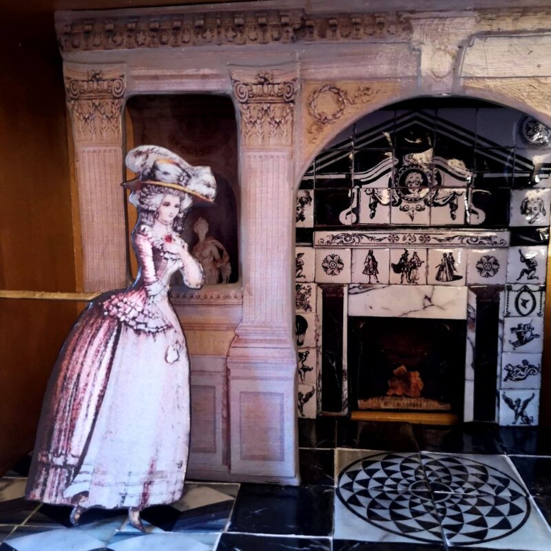 El cajón de madera mide 20 x 32,5 cm y 13,5 cm de profundidad, y dispone de cortinas negras de terciopelo que se pueden sustituir por un marco a juego. Todos los elementos, como baldosas, chimenea, figuras, cortinas de terciopelo y arquitectura interior están hechos a mano.