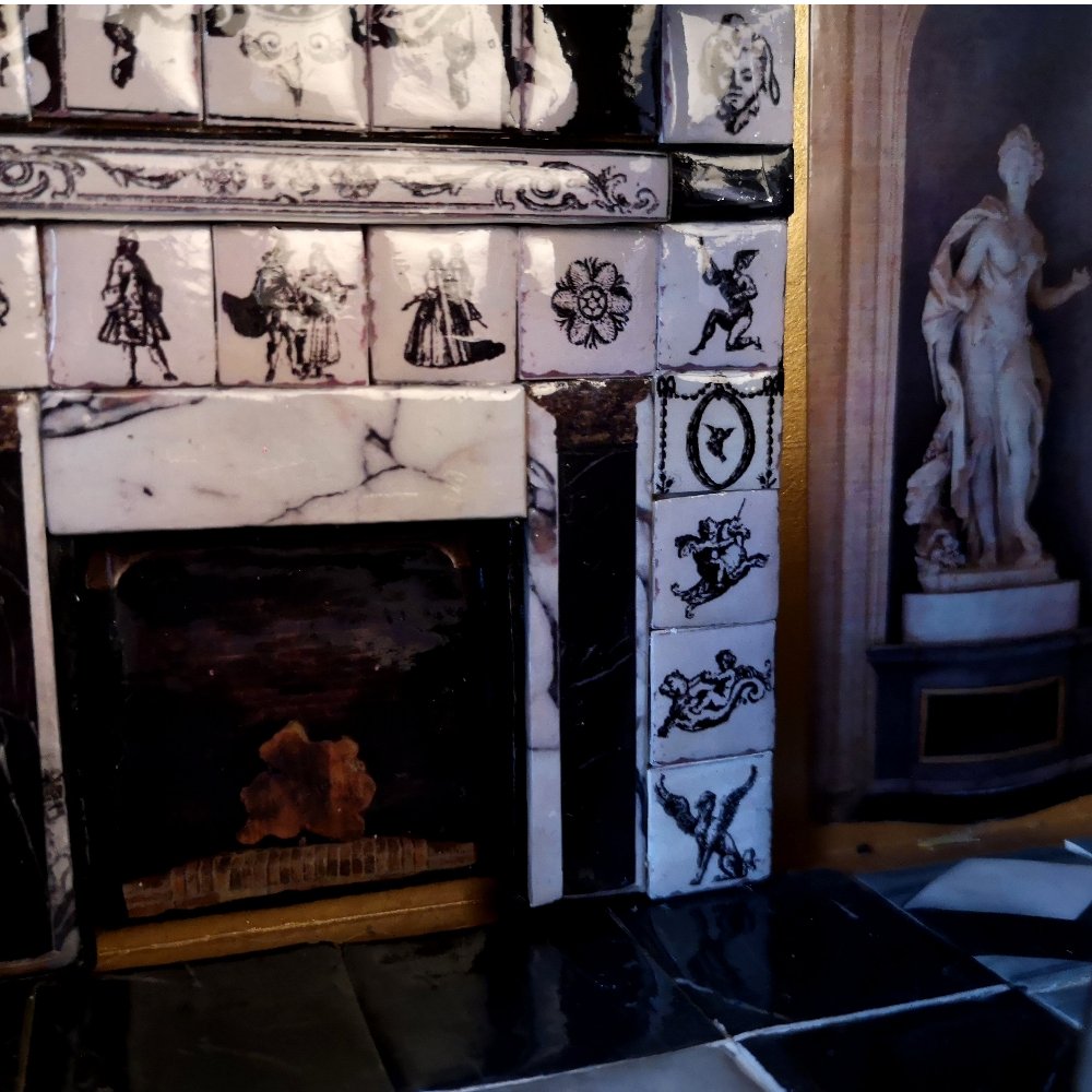 La chimenea se ha decorado con azulejos clásicos; rodean el hogar dos columnas negras y una pieza central de mármol blanco. El pavimentado consta de baldosas de imitación de calizas negras que conforman una alfombra central y, en su interior, otras con diseño circular; lateralmente, hay baldosas con formas geométricas.