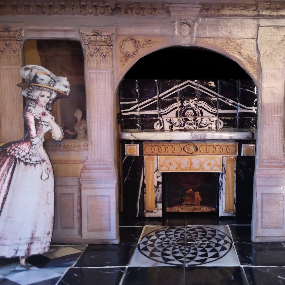 El cajón de madera mide 20 x 32,5 cm y 13,5 cm de profundidad, y dispone de cortinas negras de terciopelo que se pueden sustituir por un marco a juego. Todos los elementos, como baldosas, chimenea, figuras, cortinas de terciopelo y arquitectura interior están hechos a mano.