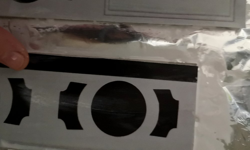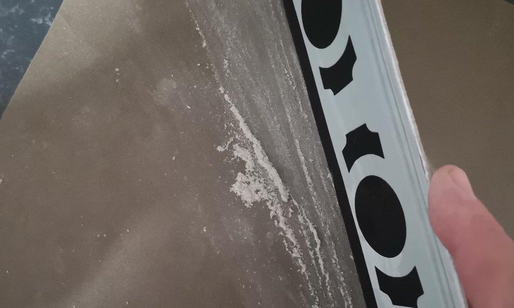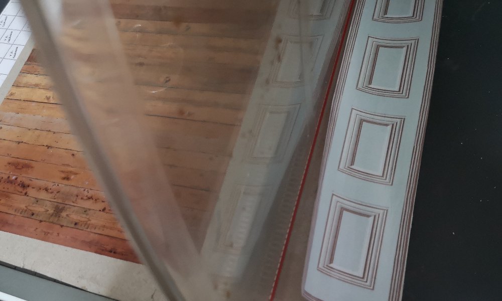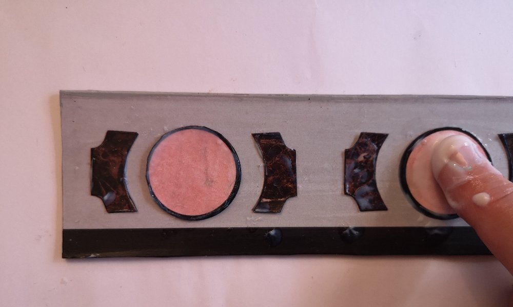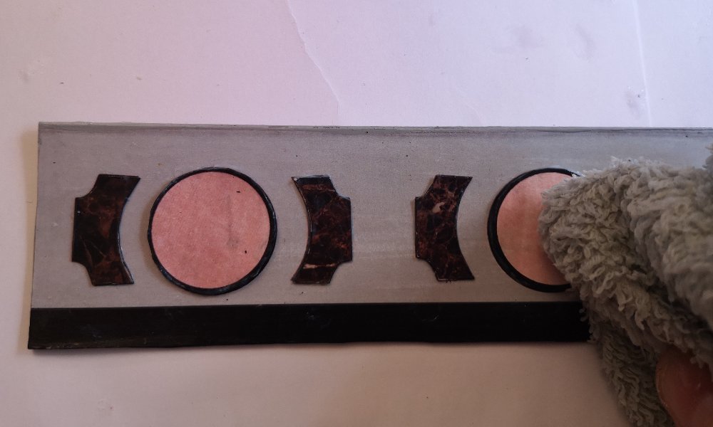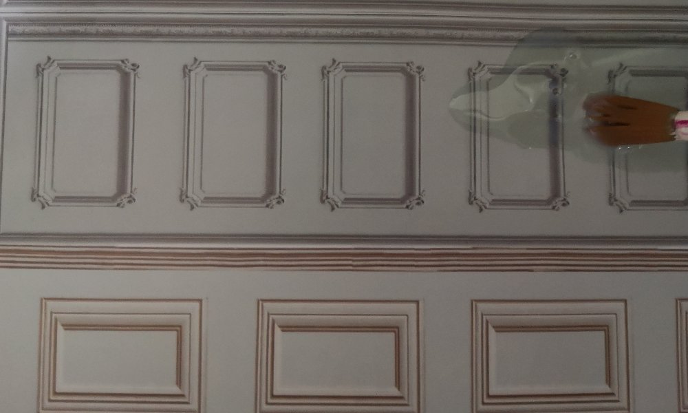 Se limpia con un paño el exceso de cola.  Aconsejo que el papel sea igual o superior a 160 g.m2, si no se forman arrugas, burbujas o se rompe. El cartón recomendado de espesor 1,2 mm. Una cola adecuada para el proceso de pegado es un podge o una cola de carpintero (transparentes,) bien extendidos. Como resultado del proceso el zócalo queda bastante apagado por la cola aplicada encima (pero que en el paso siguiente se corregirá al barnizar), y el conjunto cartón-papel pegado muy combado (también se podrá ir enderezándolo posteriormente).