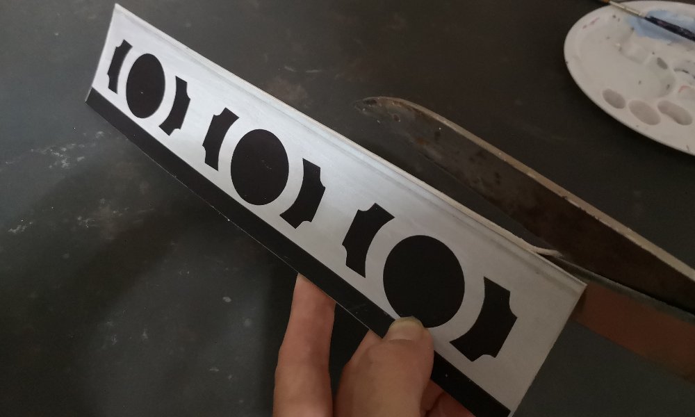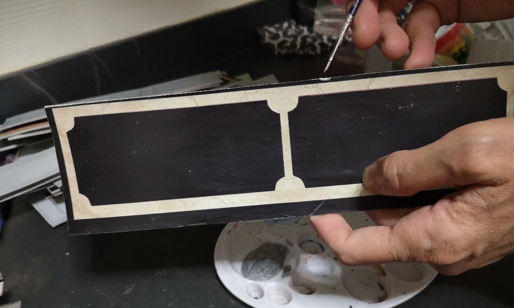 Es necesario pintar los bordes tanto de los adornos como de la base del zócalo, en caso contrario el acabado será bastante deficiente, se notará excesivamente el cartón de los márgenes. Es un paso laborioso pero vale la pena para obtener un buen resultado.