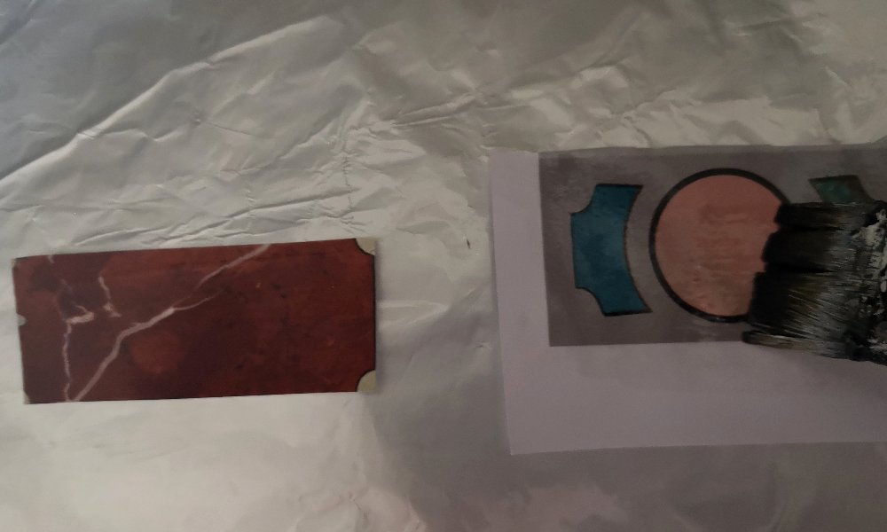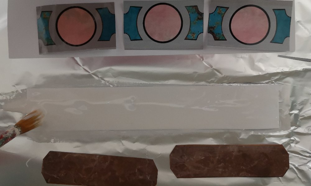 Se aplica una capa de barniz transparente sobre el papel antes de pegarse al cartón. Es importante este paso porque en el proceso de pegado posterior podemos rozar y borrar completamente el color, o rayarlo (más cuanto más claro sea –tonos grises claros o blanco sucio-), o incluso romperlo.